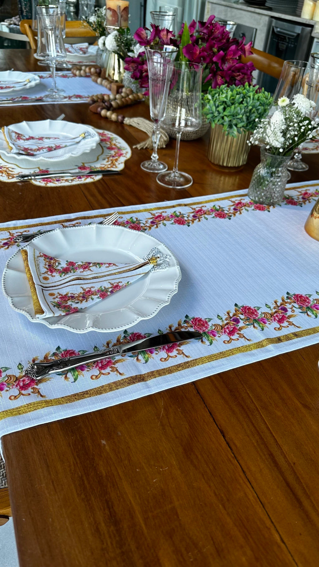 “A mesa posta ficou um encanto! Guardanapos, trilho e pratos de qualidade incrível.”