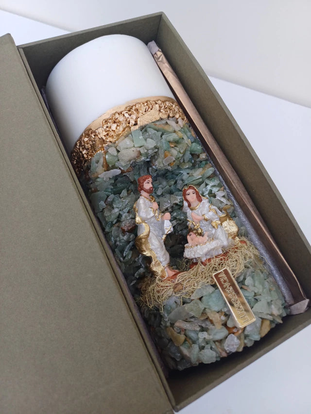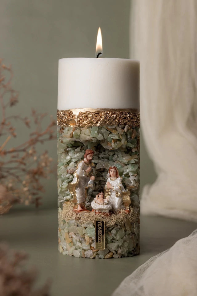 Ela mede 20 cm de altura e 9 cm de diâmetro, um tamanho ideal para se destacar em mesas, altares ou presépios.